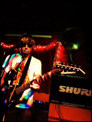 Act I: Gangbang Gordon– Do you wanna Gangbang Gordon? I sure hope so. Gangbang Gordon is the product of endless, gruesome hours spent alone in a bedroom with the Black Lips, Jay Reatard, Nobunny, and Ty Segall. Three years and hundreds of songs later, tonight is GG’s night.  GG appears on stage wearing a blonde hair wig, black shades, a crooked Cornoa hat, a pair of blue jeans, and a tard shirt, ready to destroy the PA’s Lounge with unbelievable  outsider, tard rock.  GG’s vocals are mumbled, but they fit perfectly with his simple, “what the fuck is a chord?”, guitar strumming. He rocks through his set rather quickly, rocking so hard he leaps off the stage (in a humorously planned stunt), playing on the floor on his knees, and similar awkward antics ensue. My favorite moment is when he randomly brandishes a recorder for a few seconds before tossing  it aside, deeming the instrument as unworthy. Thee (outside of) outsider finishes his set claiming that there will be no encore. Good, to have an encore after Gangbang Gordon is like asking for sloppy seconds. When one sees or listens to this man, you have to ask yourself, is it all a  joke? At the same time, even asking this question means you are taking rock and roll too seriously. Isn’t it all a joke? I don’t know. GG certainly thinks so. In any case, I hope more kids hop on the gangbang.