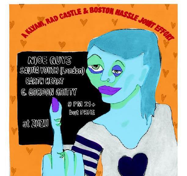 So who is playing? Well as you can see on that wonderfully designed flyer by Kristen Koenig – we’re lucky to have long time pals NICE GUYS on this one. They’ve rocked their home basement countless times, they’ve rocked The Sinclair a few times, and ZUZU is certainly a second home. They’ve been exposed as “The Allston Basement Band” and we’ve put out their famous spliff 7″ with Miami Doritos. As Chris described them on here in 2013: “The sounds they make aren’t pretty in the conventional sense, but they sound beautiful to me. My mom says it sounds like the singer is walking on hot coals, maybe, probably not though because that would hurt a lot. This set consists of some crazy Nice Guys tunes like my favorite, “Cop Walk,” which is like Black Flag meets Black Lips. In general, as I’ve stated before, Nice Guys create a sick marriage of garage and early hardcore punk (early 80’s, the only hardcore style I dig). It’s fast, it’s slimy, it’s noisy, and it’s full of slams and shrieks, but best of all it will give your noggin the perfect floggin.” LISTEN: http://niceguys666.bandcamp.com/