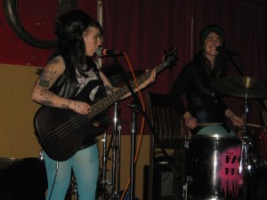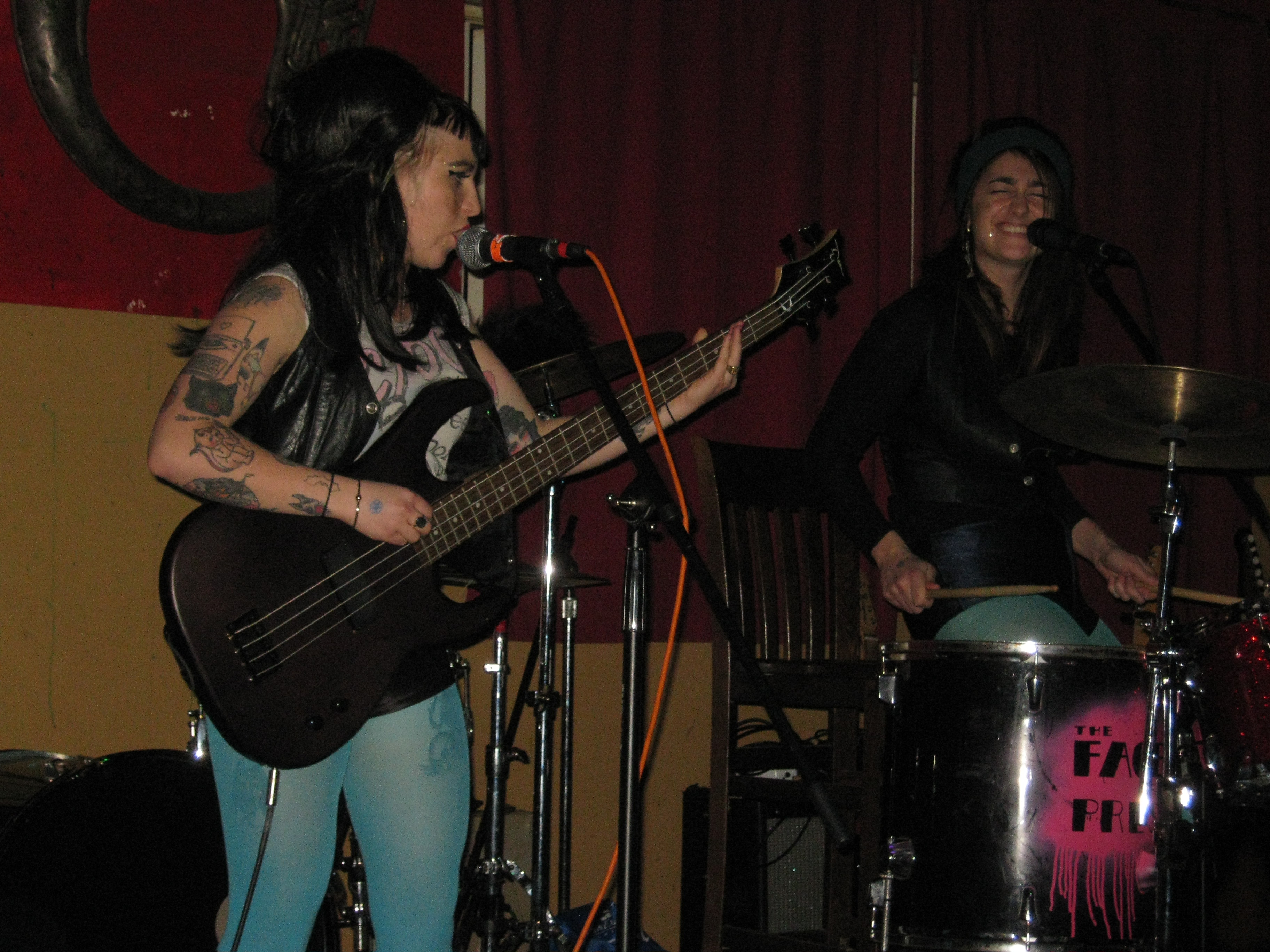 Act I: The Electric Street Queens– I have seen countless two pieces in my day, but I don’t think I’ve ever seen a two piece consisting of two ladies. I’ve seen two dudes, one dude and one dudette, but never two dudettes. Electric Street Queens, where have you been all of my life?! Electric Street Queens is Melanie Bernier ( also of Fagettes- I admired her drumming in the past) on drums and vocals and Coco Roy on bass and vocals, so basically the greatest duo of all time. Simon & Garfunkel ain’t got shit on you! This is some real good shit, don’t walk away…. if I could hold a live LP from these gals in the palm of my hand, I’d be a happy man. But, for now I have to cherish the moment. And indeed it was a great moment. Like The Coathangers, but better and sassier. Simple, stripped down songs- very catchy, fun, playful/nasty sense of humor. I can relate to that, being a sick bastard myself. They don’t seem to take themselves too seriously, which is always refreshing to see. Like I said, funny songs about beefcakes and bruises, puke and scum, you know the usual Thanksgiving family dinner convo. There is also plenty of in between song banter, such as cracking jokes about diapers and other sexualized comments that I love to hear. The band’s closer “Doncha Want To Work At The Brewery” is an amusing, macho, testosterone drippin’ anthem that demands the universal question stated in the title. During the song, Coco makes her way out to the crowd, rockin’ right up against KLYAM’s very own Glen! I’m sure he’s now looking for employment in one of our local breweries.