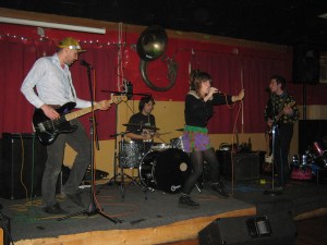 Act II: Secret Lover– The whole band sounds delightful, for lack of a better adjective, okay we’ll go with peachy keen, sure that works, I prefer that. Secret Lover sounds fairly dynamic, especially the lead vocalist. I enjoy watching her slither on and off stage, twirling the mike with ease. She has a loud, powerful voice that sounds familiar, but I can’t quite explain what or who it is. I recognize the last song they play, “Rubber.” It’s a catchy, little number and the backing vocals (“bahhh buppp bah bah bah”) are memorable. Check out their music here: http://secretlover.bandcamp.com/