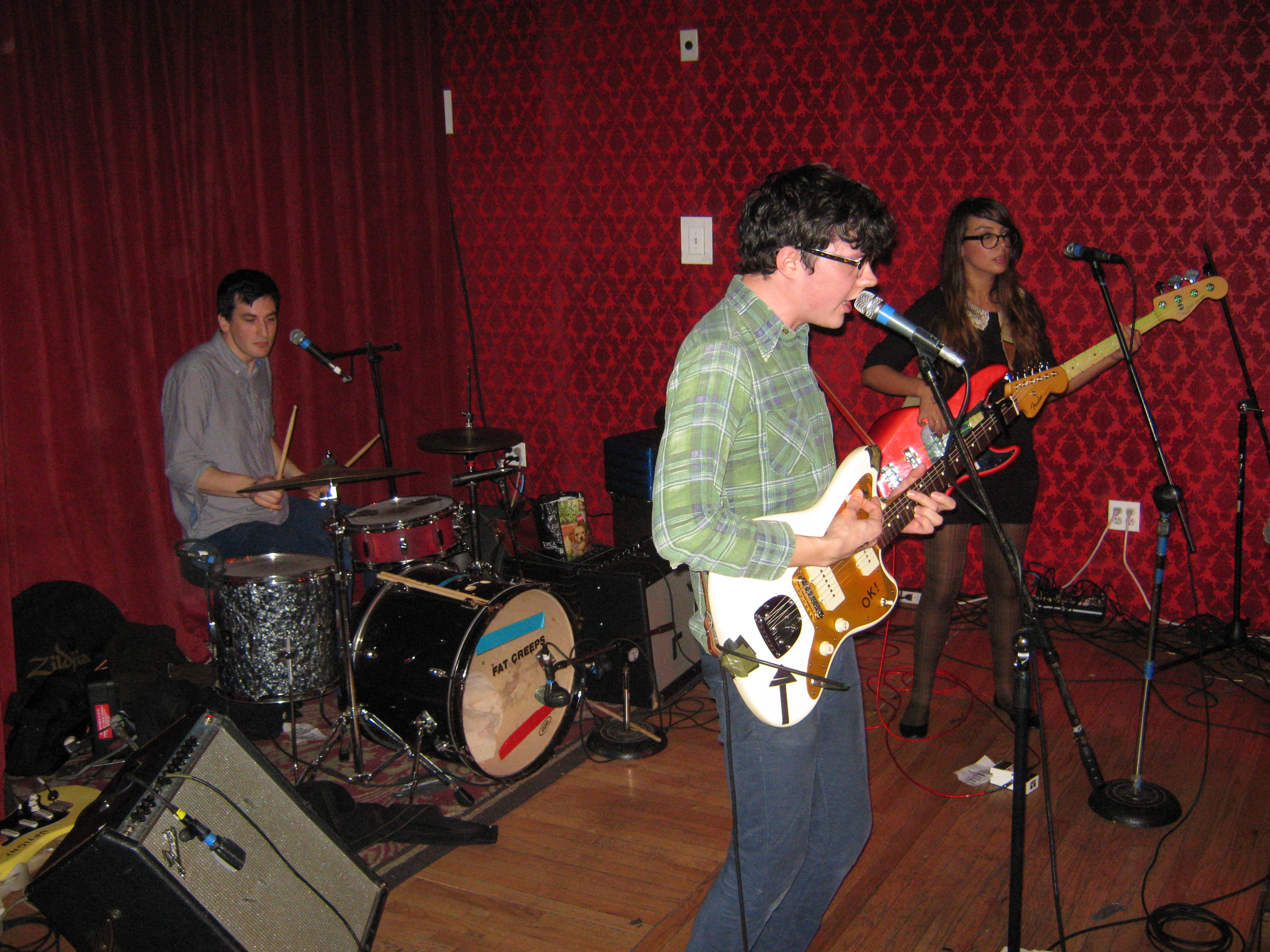 Act II: Bent Shapes– If some tourist yahoo asked me to name the best bands around Boston, the three opening acts on this bill (The Migs, Fat Creeps, and Bent Shapes) would definitely appear on that list. In fact, Bent Shapes were probably the first local band I really got into, about a few years back now. It’s not hard to see why this trio sticks out- they are able to blend Weezer/Blink 182 esque pop punk with garage rock. The thinking man’s garage perhaps. Haha, actually that reminds me of something Glen said earlier in the evening, that Bent Shape have this “college” quality to them. I agree with him on this point, and that’s funny because their music to me shares a similarity to another jangely pop, “college” band: The Pains of Being Pure At Heart. Both bands unleash simple, catchy songs with strong pop hooks. Personally, what I love about bands like Bent Shapes is that a lot of the music they seem to reference (pop punk) is not particularly to my liking, yet I seriously dig these guys. I kind of like it that way, I almost have a greater appreciation for them. Regardless of tastes, all three members are exceptional. If you’re reading this and haven’t heard of this band, click the link here, Do iT! http://bentshapes.bandcamp.com/